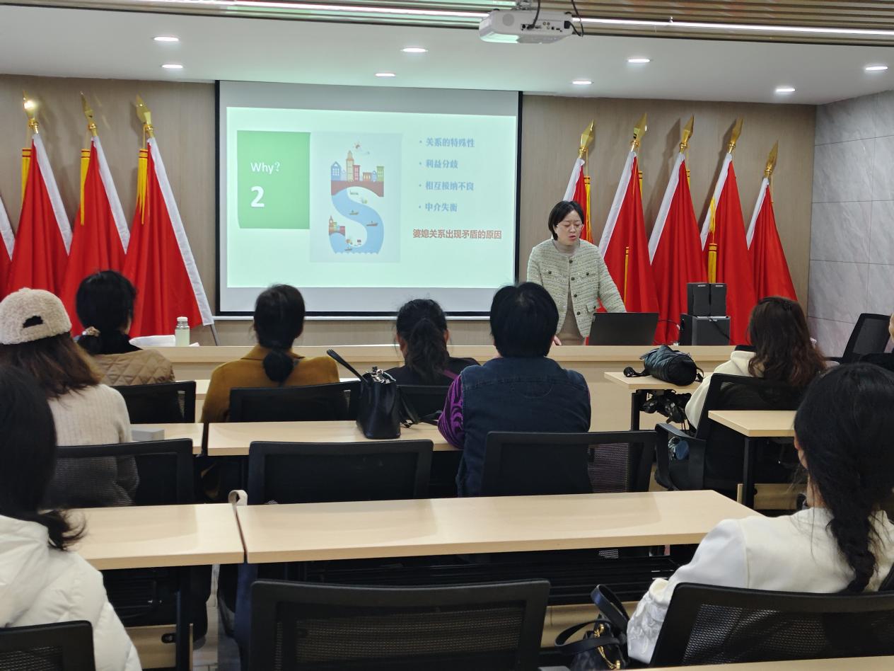 为深入推动社区精神文明建设,营造和谐友爱的家庭氛围,10月20日下午,由清江浦区妇联主办,长东街道三门社区妇联、御码头商圈妇联携手曙光心理咨询中心共同开展了《婆媳关系相处有道》的公益讲座,本次活动特别邀请了专业心理咨询师、家庭关系辅导专家刘玲老师担任主讲,辖区居民及社会组织女性成员热情参与,反响热烈。