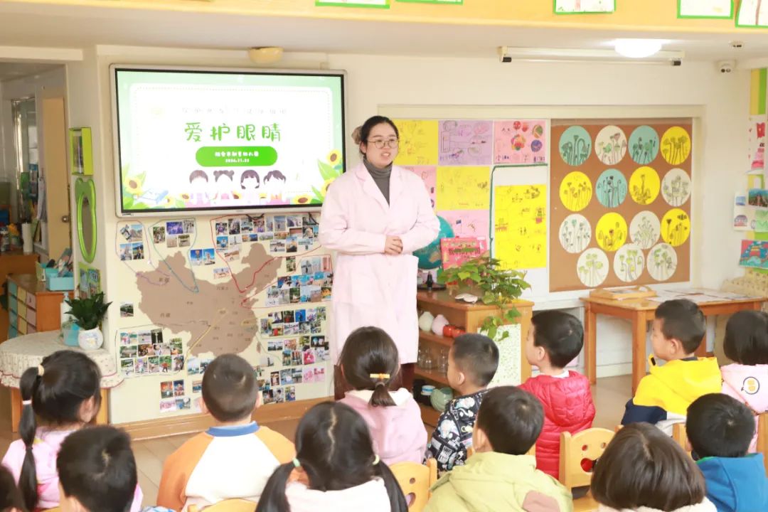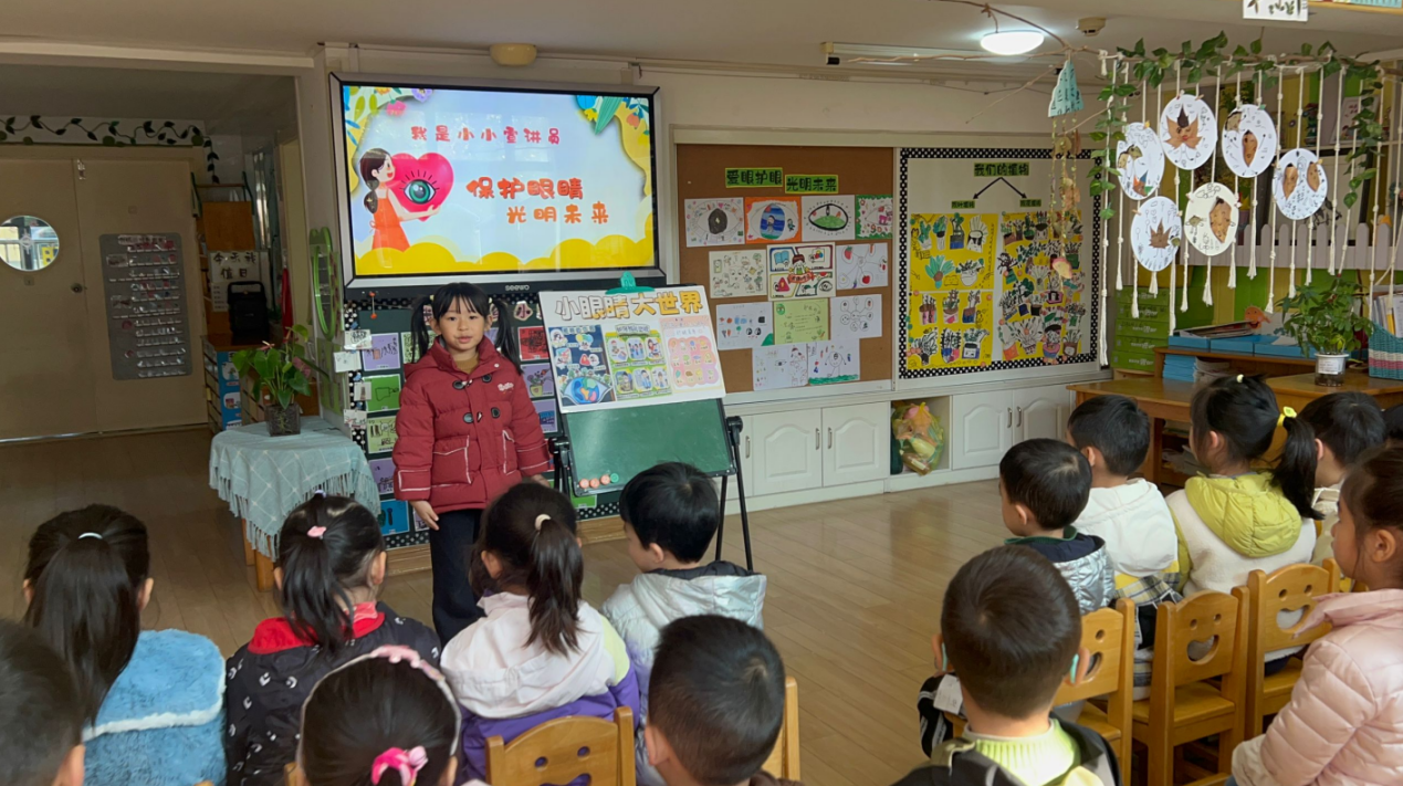 保健教师结合全国“爱眼日”、全国近视防控宣传教育月等契机,组织幼儿开展专题讲座,不断增强幼儿爱眼护眼意识,帮助其掌握预防近视的方法。